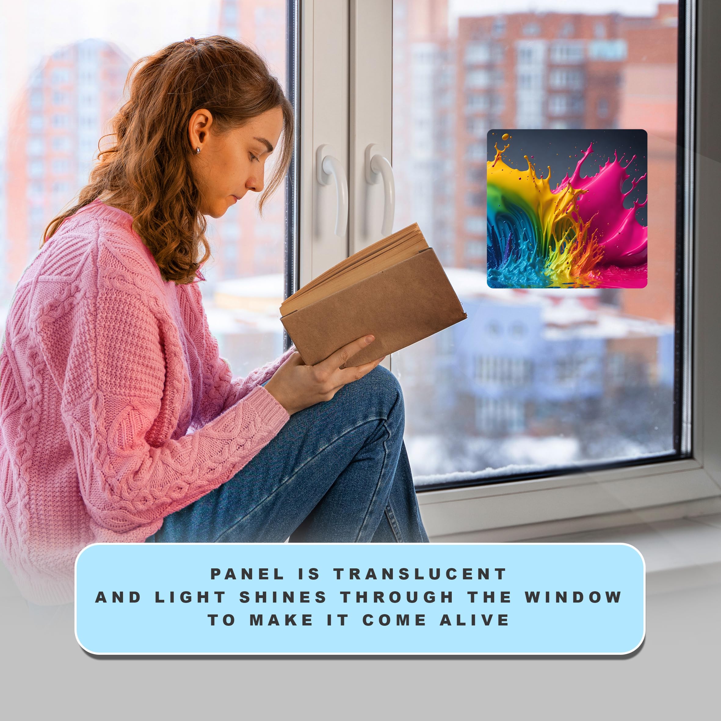Bursting with color, the sunlight streams through each Panel generating explosive imagery throughout your room. Just place it near a window or stick it on with the suction cups provided, and watch the sunlight bring it to life. Our standard size of Sunlight Art® Panels is 11×11”, however, you can order any Panel in a custom size – 8×8”,15×15” or larger – on the site here. Each Sunlight Art® mixed-media image is printed exclusively on transparent panels.